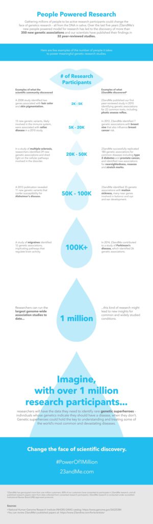 The power of one million is a new milestone for us. However, the power of one is just as important. One person’s contribution to research at 23andMe informs over 230 genetic studies.
