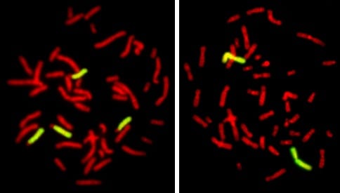 Chromosome 2 painting in a human cell, right, and an orangutan cell, left (which has 24 chromosomes like a chimp). Stefan Mueller, Department Biologie II der Ludwig-Maximilians-Universitie Muenchen.