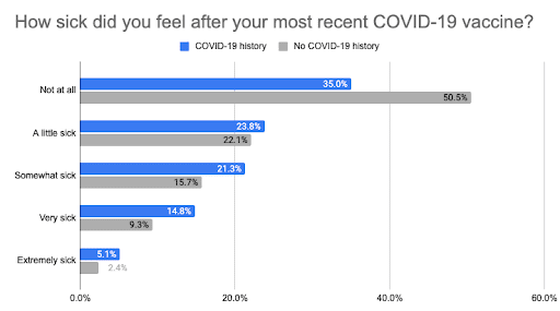 You may have heard the rumor that people who have had COVID-19 are more likely to feel sick after receiving a vaccine. According to 23andMe data, that seems to be true — a larger proportion of consented research participants previously infected with COVID-19 reported feeling sick for every degree of sickness (from “a little” to “extremely”) compared to those not previously infected with COVID-19. In fact, only a third of participants with a previous infection experienced no symptoms from their vaccine, compared to half of those without a COVID-19 history.