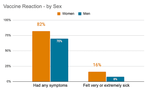 Women were more likely to have any symptoms, have more whole body (systemic) symptoms, and generally feel sicker following their vaccination compared to men.
