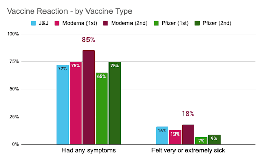 Compared to the other vaccines, it was those people with a second dose Moderna vaccination who most often reported experiencing any symptoms (85%), and most often reported feeling either very or extremely sick (18%) after their vaccination. Again, these differences were not related to clinical outcomes. In other words, these are relatively modest reactions to the vaccines, but the vaccines still offered strong protection against the virus. In addition, these reactions were generally only for a couple of days after the vaccination. Whereas the severity of COVID-19 infections includes potential weeks or months of hospitalization or death. In addition, scientists still don’t fully know the timeline for so-called COVID-19 “longhaulers,” people dealing with lingering symptoms long after being infected.