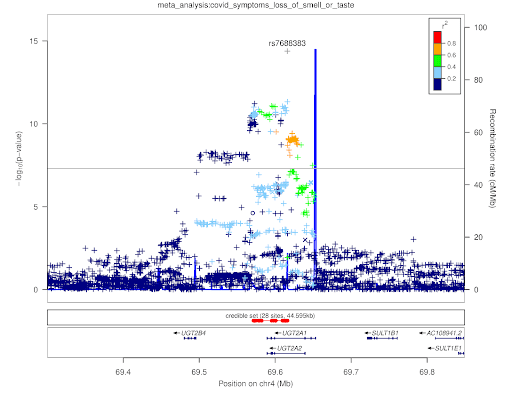 Little is known about what the genetic variant (rs7688383) does, or how it impacts the likelihood of losing your smell or taste during infection with SARS-CoV-2. But the olfactory genes UGT2A1/2 are part of a family of enzymes called uridine diphosphate glycosyltransferases and are expressed in the olfactory epithelium and metabolize odorant compounds. In the 23andMe database, both of these genes are related to such things as ice-cream taste preference and ability to smell as measured by a self-reported five-point scale ranging from very poor to very good.