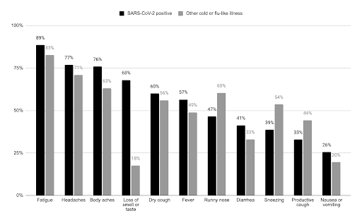 Figure 3. Frequency of symptoms reported among respondents with a cold or flu-like illness who did and did not have a positive SARS-CoV-2 result in the 23andMe study, ordered by percentage difference.