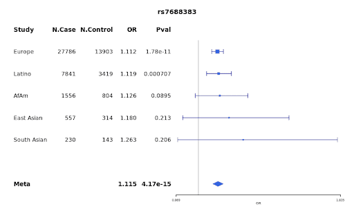 The scientists ran separate genome-wide association studies for individuals of European, Latino, African American, East Asian, and South Asian ancestries, and then combined the data via a meta-analysis. The researchers evaluated the effect of the top-associated single nucleotide polymorphism (SNP) in the different ancestral populations (Figure 2).