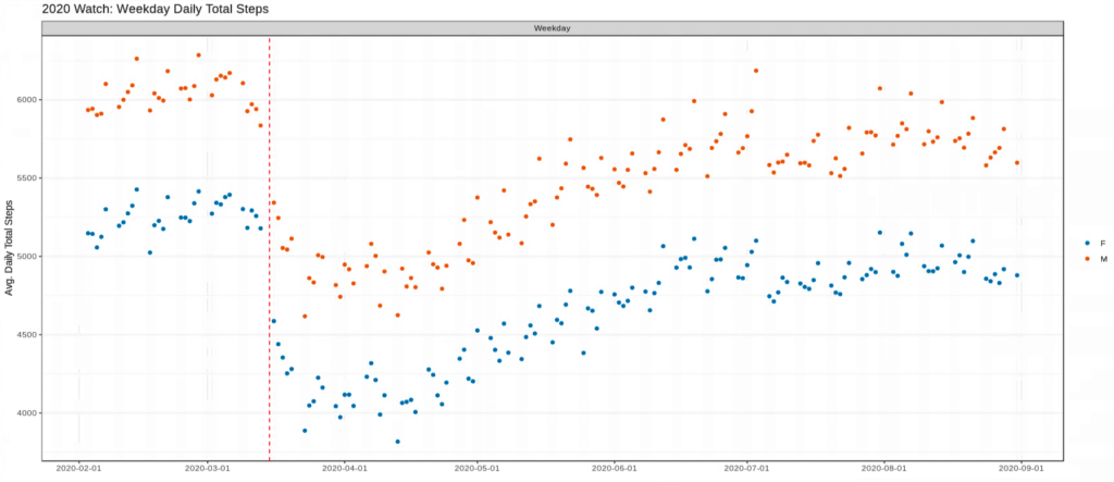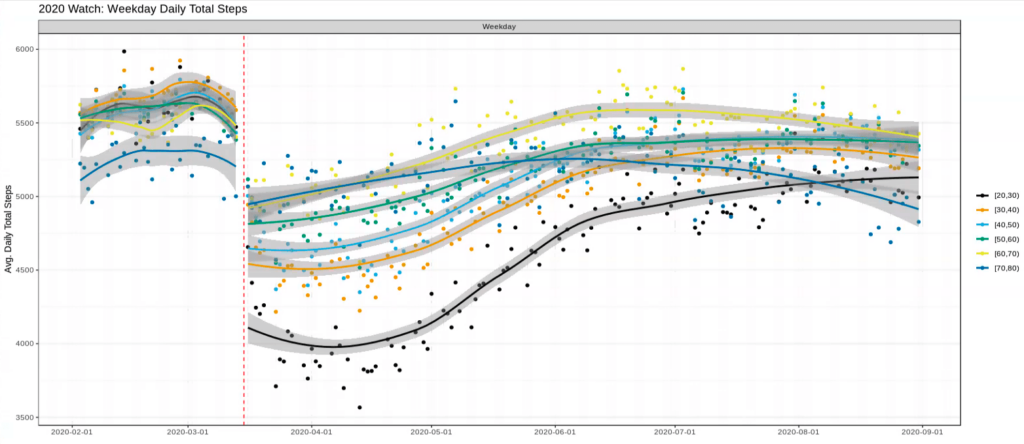Enabled by our powerful rapid data collection platform, our analyses tell a story of both resilience and vulnerability in real-time. The overall conclusion is hopeful: even amidst the pandemic-related disruptions, many people are finding ways to increase their daily movement. This finding is especially encouraging in light of the recent studies showing that exercise may be a successful strategy to boost mental health in these challenging times.