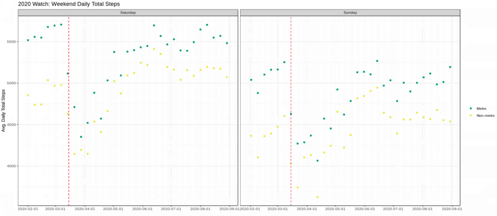 Although rural step counts returned to their pre-COVID-19 levels, a full recovery has so far eluded the urban residents — likely reflecting the lasting changes to workplace and school commutes rather than leisure time physical activity. This hypothesis is supported by data collected on weekends (Figure 4b): unlike in weekday data, step counts recorded on Saturdays and Sundays were consistently higher in metropolitan areas.