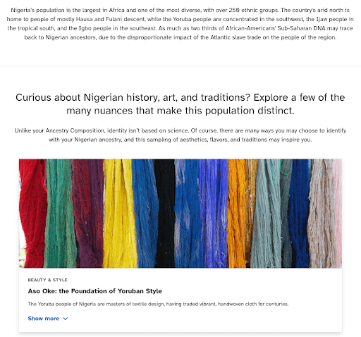 With this update, some customers with African ancestry, including those with Ashanti ancestry, will discover new Ancestry Composition matches to one or more of 25 new genetic groups, often called reference populations, representing present-day ethnolinguistic groups in Sub-Saharan Africa. These new groups include the Igbo, Yoruba, Kongo, Mandinka, Shona, and Ashanti peoples. Customers will also find a map marking where the people in each reference population and their ancestors have lived for generations.