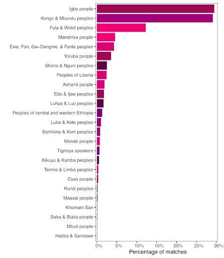 These proportions likely reflect the impact of the transatlantic slave trade in which the majority of the 12.5 million enslaved Africans were taken from ethnolinguistic groups residing in the mid to southern Atlantic coast of Africa and forced into the Americas. Each of the remaining ethnolinguistic groups is a match for fewer than 5 percent of customers.