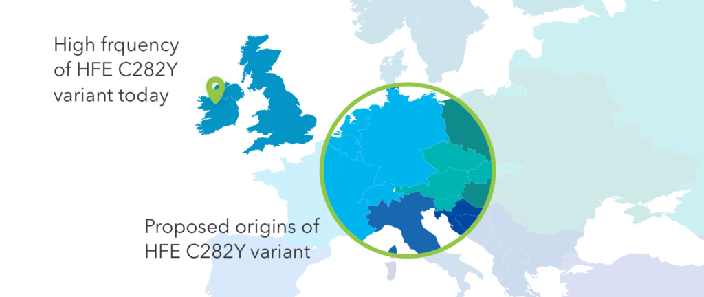 So, for example, people with ancestry from the British Isles are more likely to carry a variant in the HFE gene associated with hereditary hemochromatosis. Hereditary hemochromatosis, known as the “Celtic Curse,” is a condition characterized by an over-absorption of iron which in turn can cause damage to the joints and specific organs.