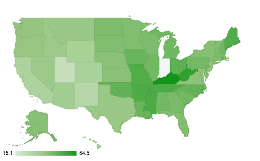 State by State Cancer rate per 100,000 people. Source: U.S. Cancer Statistics Working Group. https://www.cdc.gov/cancer/dataviz, released in June 2024.