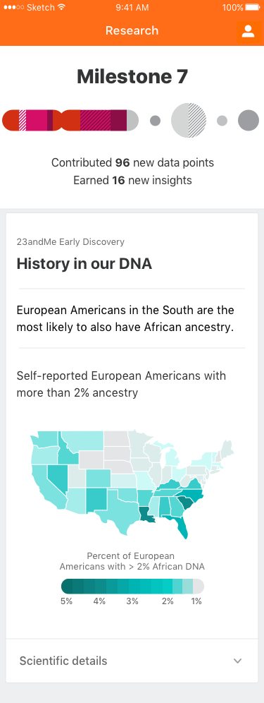 In this first iteration, the application allows customers the chance to answer survey questions and gain new insight into the genetics behind traits and conditions. Similar to the logged-in experience, as customers answer questions, they will receive milestone insights with information about different studies and research data to directly see what they’re contributing to.