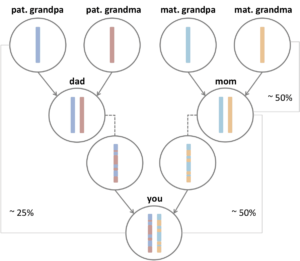Recall that everyone has two copies of each chromosome (except for the X chromosome in men), one from mom and one from dad. These copies exchange analogous segments of DNA with each other — a process called recombination — before being passed on to future generations, such that the set of chromosomes you received from your mother (or father) is a mix of the DNA that she got from her parents. Since each parent contributed 50% of your DNA, that means that the % of DNA shared between you and each grandparent is roughly 25%. Every generation you go back will halve the % of DNA shared, on average.