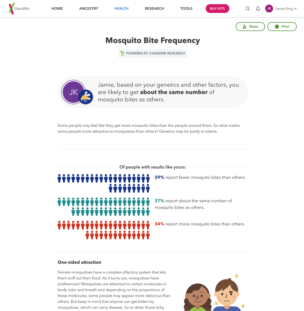 You probably already know if you’re a mosquito magnet, but 23andMe’s Mosquito Bite Frequency report can tell you if your genetics may explain why you’re more attractive to the bugs than others.
