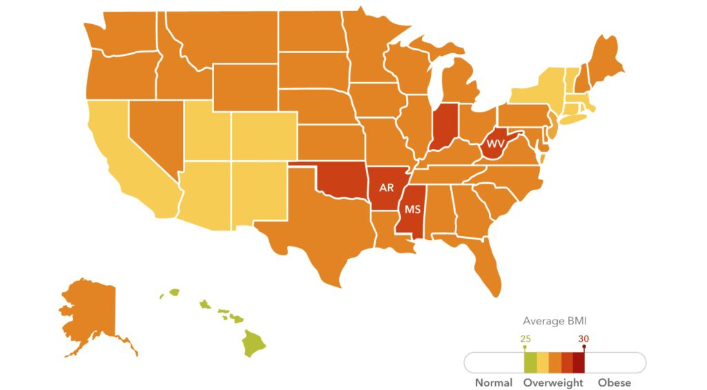 The average BMI of 23andMe participants in every US state is over 25, which is in the range described by the Centers of Disease Control (CDC) as overweight. According to the CDC, the states with the highest prevalence of obesity in 2014 were Arkansas (AR), West Virginia, WV), and Mississippi (MS).