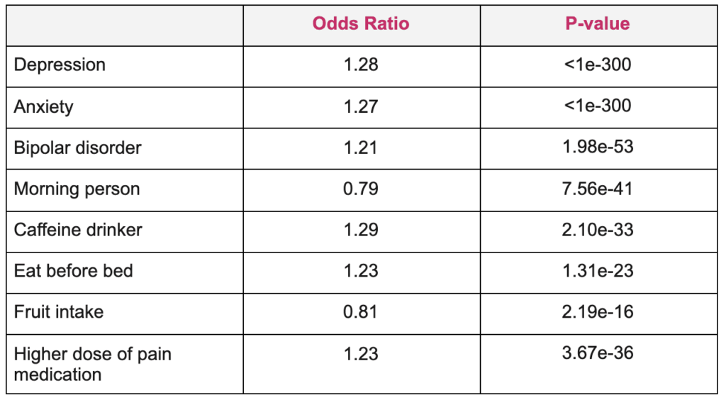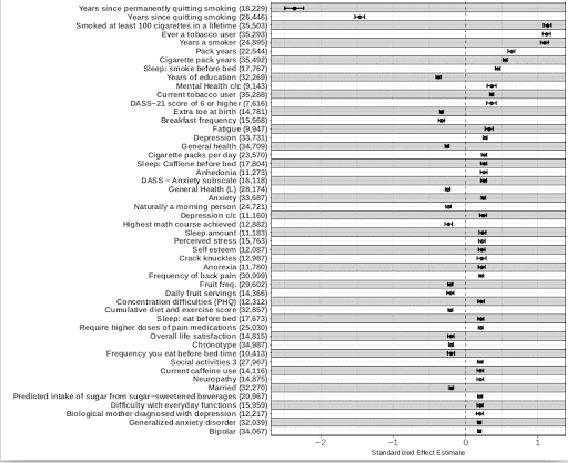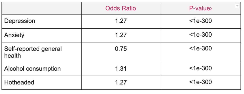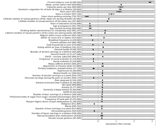 We found associations between vaping and such things as being more likely to be stressed, depressed, and anxious compared to those who do not vape. People who vape also were more likely to be diagnosed with bi-polar disorder. We saw associations between people who vape being more likely to report poor overall health, low life satisfaction as well as being less likely to exercise and eat right. People who vape in our data also were more likely to eat less fruit, drink more caffeine, need higher doses of pain medication, and are less likely to be a morning person. (More associations found with e-cigarette use within the 23andMe database are summarized in Figure 1. )