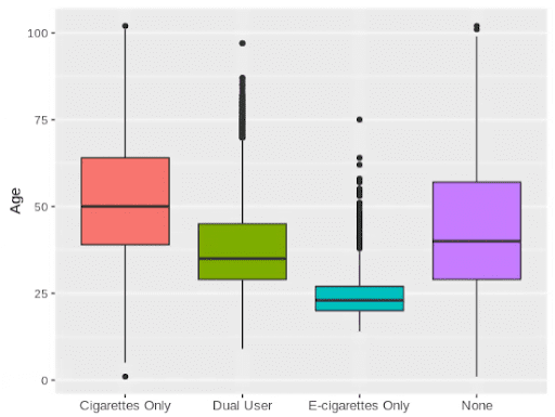 Beyond being younger, individuals who are dual users — they smoke and vape — come from locations with a slightly lower median household income when compared to cigarette-only users, e-cigarette only users, and those that used none. Lastly, when comparing the four use groups in regards to years of education, research participants that do not smoke or vape tend to have obtained the highest amount of education.