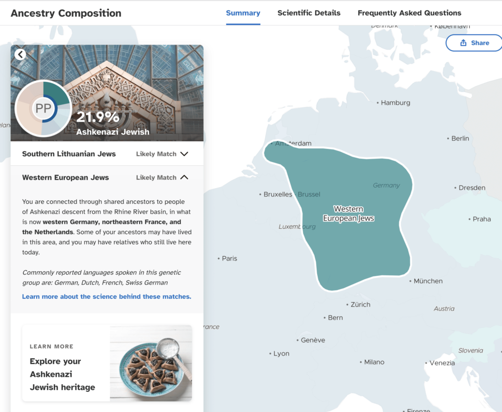 Some of these regions overlap, but they map to areas with deep historical and cultural significance for people of Ashkenazi ancestry. The long history of pogroms, persecution, and the devastating horror of the Holocaust annihilated the connections of many of those with Ashkenazi ancestry to their families’ historical origins. DNA testing has the potential to offer hints to those connections where family history may be lacking.