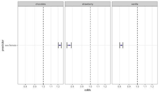 Figure 2: Odds ratio plot illustrating flavor preference. Odds ratios greater than 1 (to the right of the dotted line) indicate a preference by women. In this case, women were much more likely to prefer chocolate flavor and men favored vanilla or strawberry.