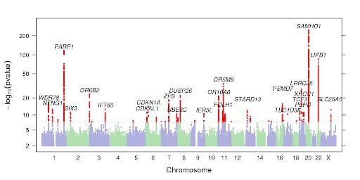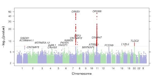 We then carried out two genome-wide association studies (GWAS) of ice cream flavor preferences in our research participants of European ancestry. Because vanilla is a much more mild flavor than chocolate or strawberry, we considered it our “case.” Our first comparison was between vanilla and chocolate flavors, controlling for age, sex, ancestry, and technical artifacts. We found 45 genome-wide significant hits [Figure 3]. Many of these hits are near genes for which the biological function is not well studied. But five hits are near the gene family of olfactory receptors, which are important for smell and taste
