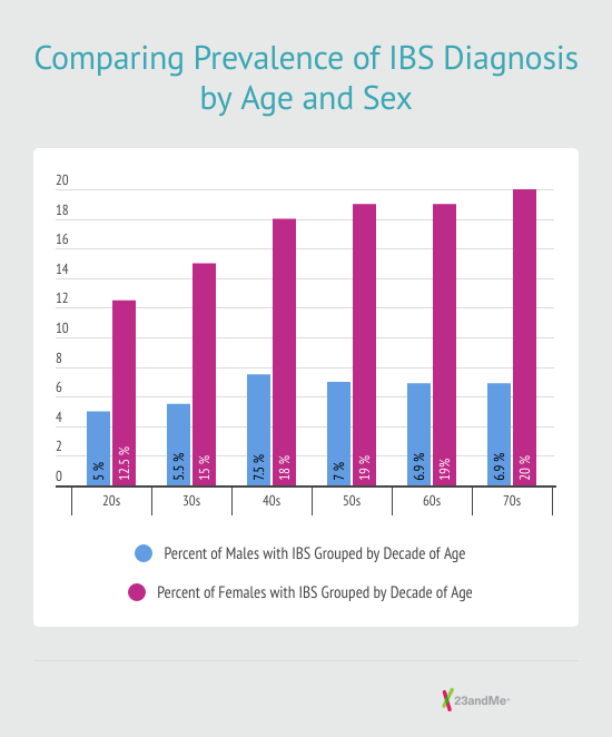 According to data from 23andMe, females are about two and a half times more likely to develop the condition than males. (See figure that compares males and females with IBS by age.) While it’s well documented that sex can impact the likelihood of an individual’s likelihood of developing IBS, far less is known about the role genetics play in this common condition.
