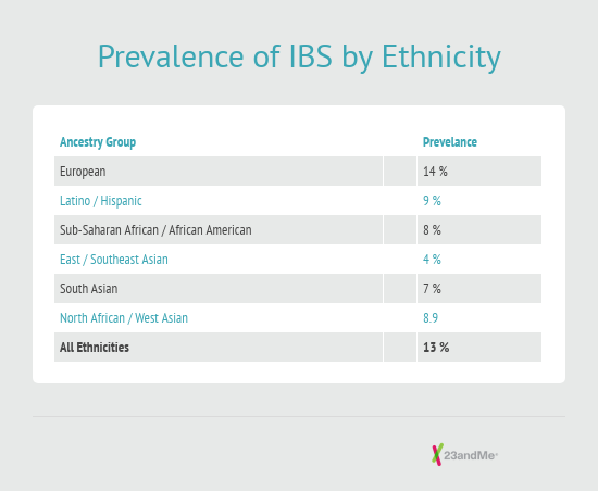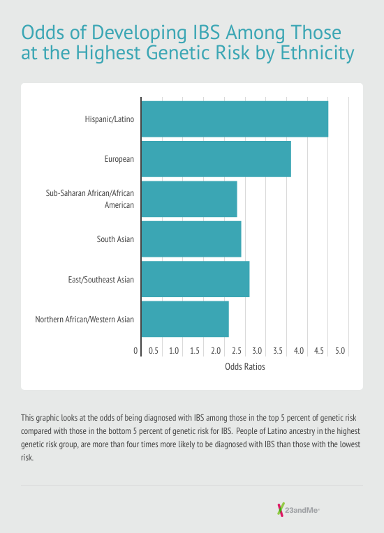In looking at ethnicity, people with largely Latino or largely European ancestry have the highest likelihood of developing IBS compared to those of other ethnicities. For example, people with mostly European ancestry are almost three times more likely to develop IBS than those of mostly East Asian ancestry.