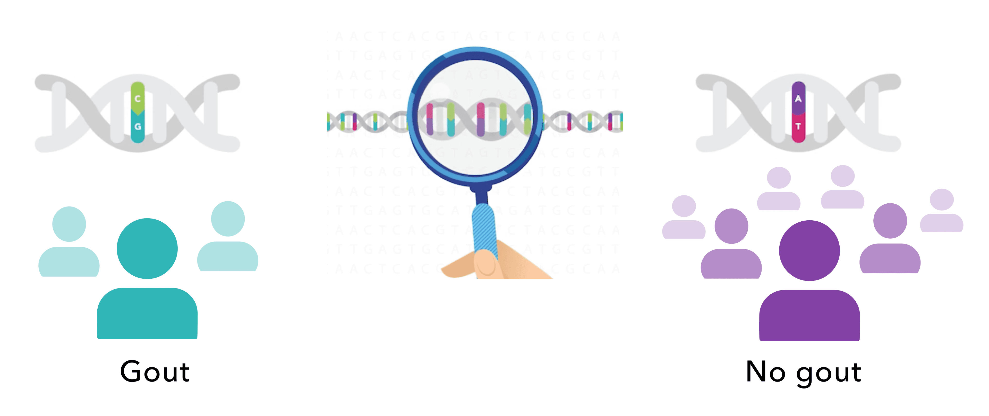 23andMe scientists compared the DNA variants of many 23andMe research participants who said they have gout to the variants of many participants who said they don’t have gout. During this process, the scientists discovered thousands of variants across many different genes that are more common among people with gout, which means those variants are considered to be “associated” with gout.