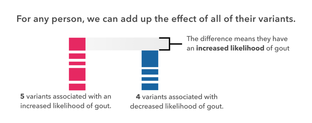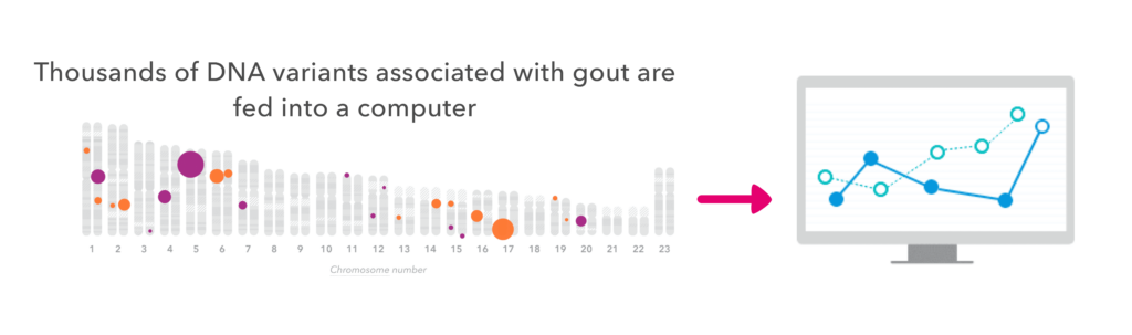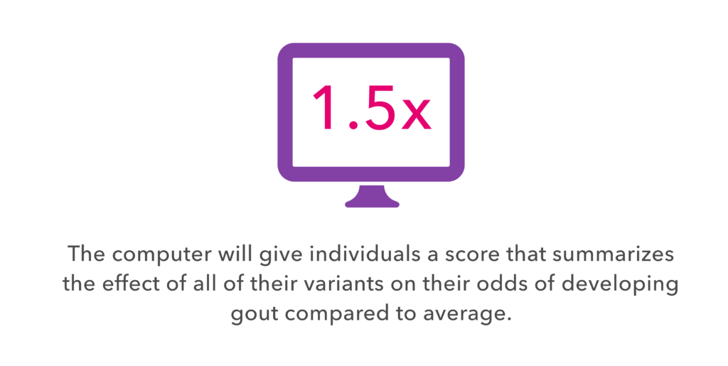 We send your DNA variants through this trained computer algorithm, and it computes your likelihood of developing gout as a polygenic score.