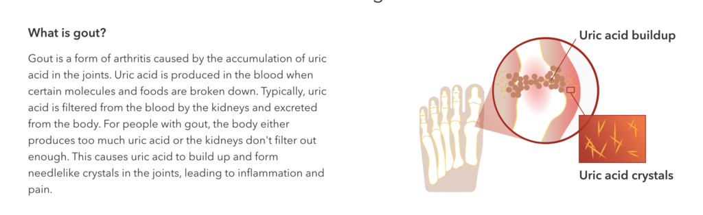 My mother was shocked by the diagnosis. She’d read enough historical novels to know that gout was once called “the rich man’s disease” and “the disease of kings,” thanks to its association with alcohol and rich foods like red meat. How could she—a woman who lives by the motto “moderation in all things”—have a condition long associated with excess and intemperance?