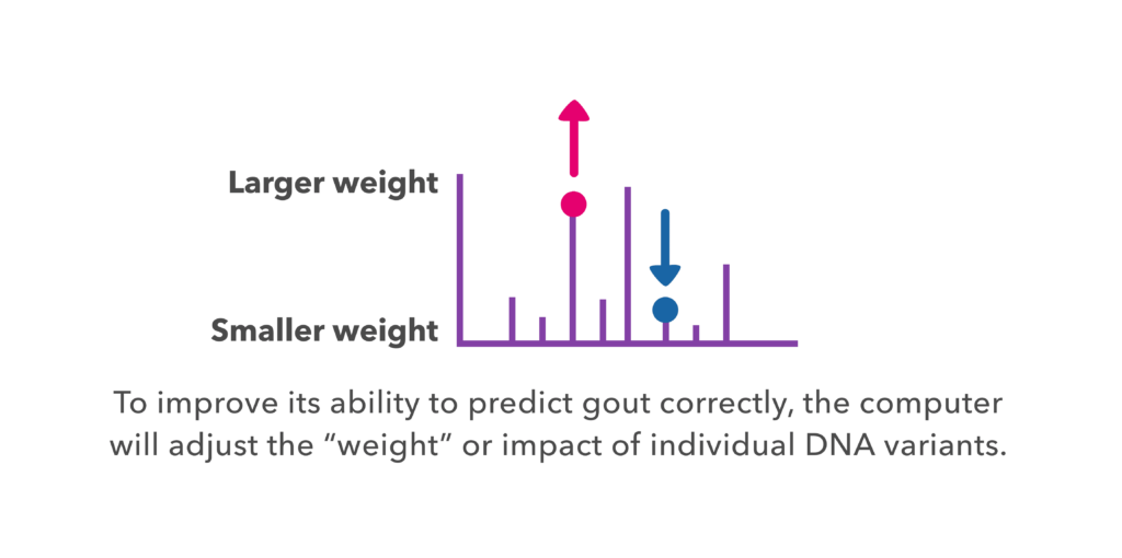 So, the computer goes back to the drawing board, rapidly adjusting and tuning the impact, or “weight,” of thousands of DNA variants until it finds the best set of parameters to predict gout.