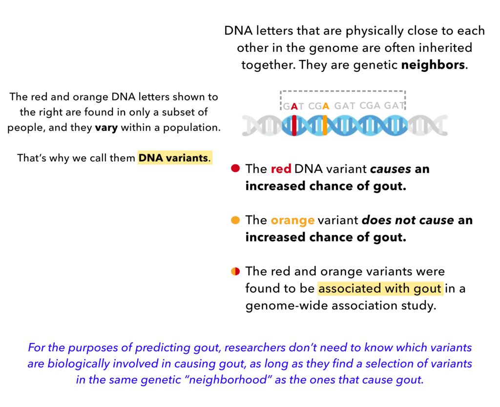 - Just because a DNA variant is statistically associated with a condition doesn’t necessarily mean that it causes the condition. That’s because variants that are physically close to each other in your genome tend to be inherited together, which makes it difficult to figure out which of the linked variants actually causes increased likelihood. But, that’s okay! For the purposes of predicting a condition, researchers don’t need to know which variants are biologically involved, as long as they find a selection of variants in the same genetic “neighborhood” as the ones that cause the condition.