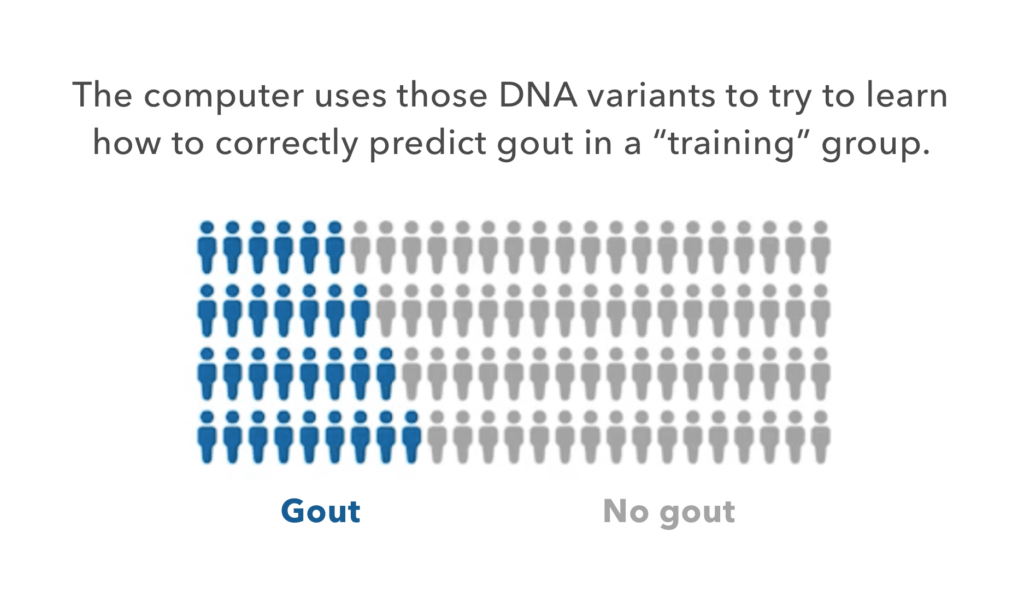 In this step, called “training,” the computer’s goal is to use the DNA variants found in the genome wide association study as a reference to help it learn how to identify patterns in the data and to predict gout correctly in a group of people whose history of gout is already known.