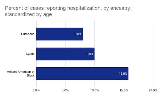 23andMe’s data replicates findings from the US Centers for Disease Control and Prevention (CDC) showing that not only are Black people and Latinos more likely to contract the virus, they are also much more likely to end up in the hospital across all age groups.