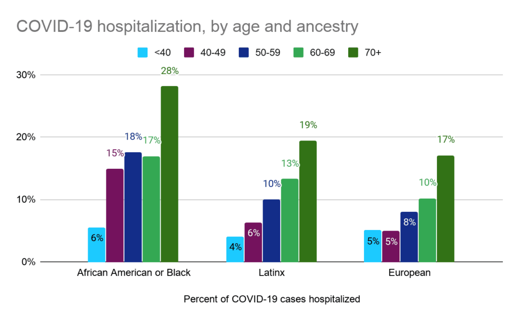 23andMe’s data shows that African Americans, who tested positive for COVID-19, were almost twice as likely as whites to be hospitalized. Latinos had a slightly higher risk for hospitalization compared to whites. When adjusted for age, sex, income, and other underlying health conditions, Black people are still 80 percent more likely to be hospitalized for COVID-19 than whites.