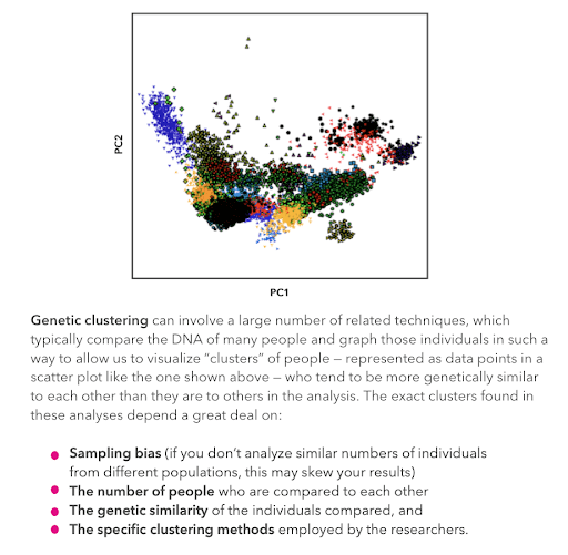 - Then, we used a technique called genetic clustering to identify potential groups of individuals who share higher levels of DNA with each other than they do with others in the analysis. These genetic groups became our reference groups for this feature, and we then are able to compare customers’ DNA to the DNA of individuals within these reference groups.