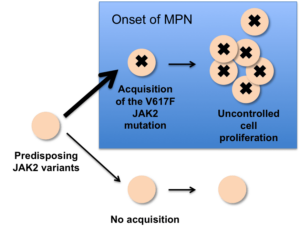 This figure shows that people who inherit predisposing JAK2 variants have higher odds of acquiring the JAK2 V617F mutation, which is thought to push the cell to make multiple copies of itself. But it’s not the only factor leading to MPN. Although most people with the polycythemia vera (PV) form of MPN have the V617F mutation, many people with other types of MPN do not.