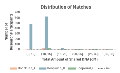 We found that only about 1,240 research participants—less than 0.011% of the individuals included in our analysis—share any sort of genetic connection to the Roopkund individuals. And of those participants, we can count the number of individuals who share over 30 cM of DNA (what we label a “significant genetic connection” in the Historical Matches feature) on just one hand. In fact, we found so few “significant relatives” that the chances any of those connections trace back to a recent shared common ancestor on a genealogical family tree are extremely slim.