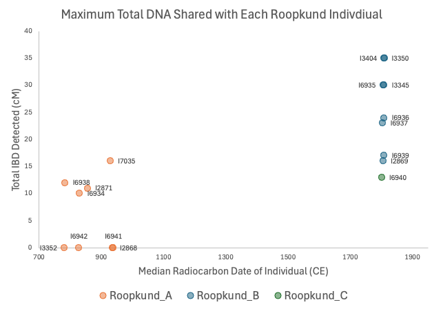 In addition to occurring more frequently, the Roopkund B individuals also shared some of the strongest genetic connections to 23andMe research participants, as shown in the figure below which depicts the maximum amount of DNA that each Roopkund individual shared with a research participant.