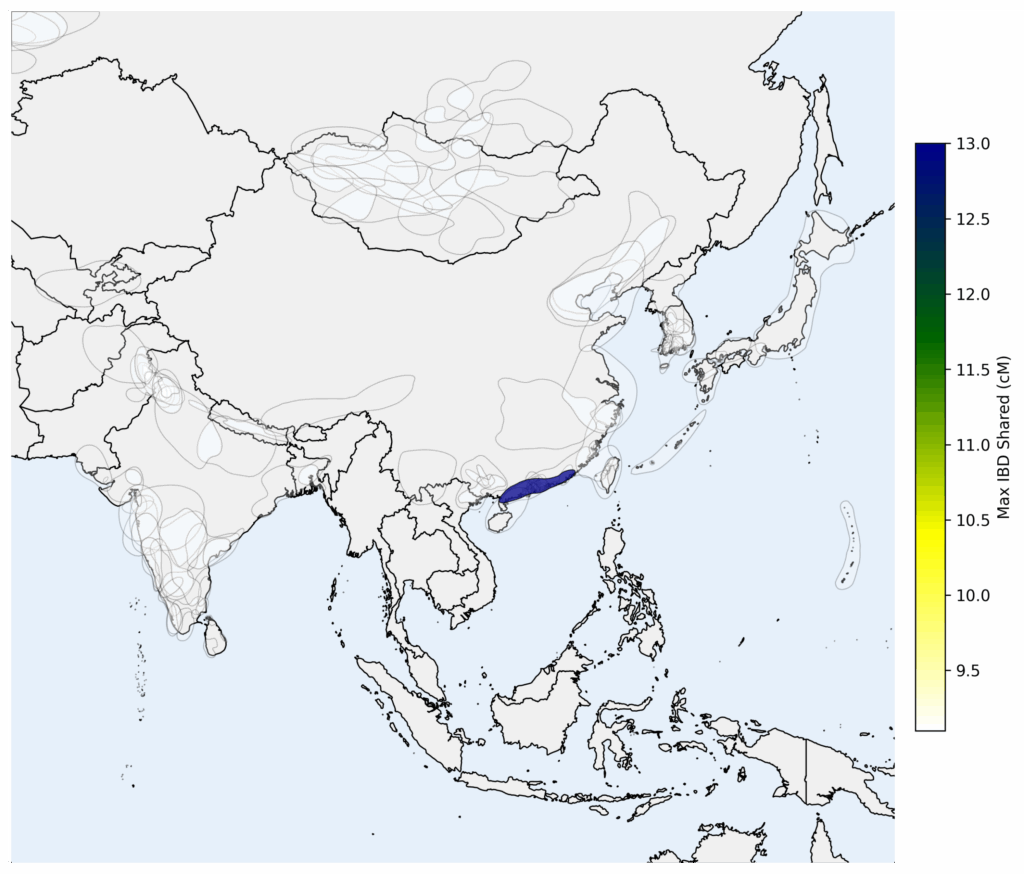 Since the Roopkund A and Roopkund C individuals shared far fewer genetic connections to 23andMe research participants, it was hard to localize their ancestry in the same way. But we were able to connect the Roopkund C individual to a single Genetic Group, located in China. This finding is generally consistent with the original study, where this individual exhibited connections to populations in East and Southeast Asia.