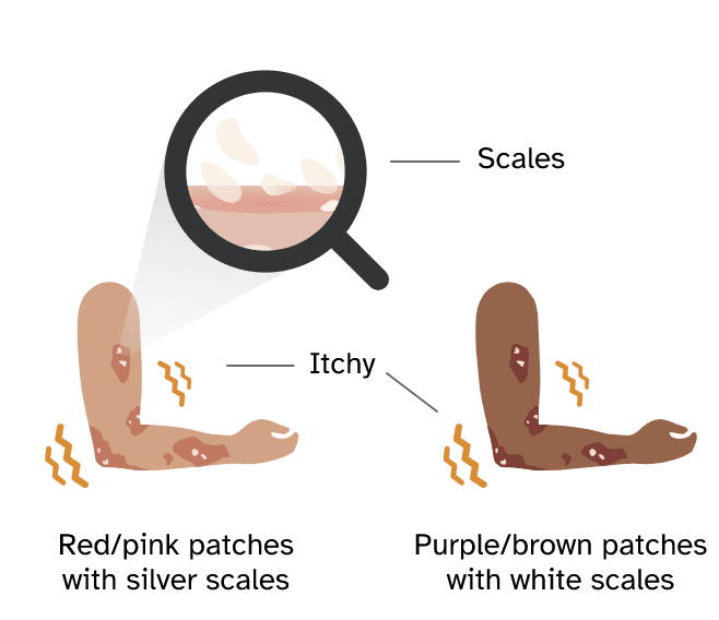 Like eczema, psoriasis can be itchy, but symptoms are more associated with a stinging or burning sensation, and more inflammation of the skin. Psoriasis also typically includes thickening patches on the skin, called “plaques.” In addition, the condition sometimes includes areas of skin that are covered in silvery-white scales that flake off.