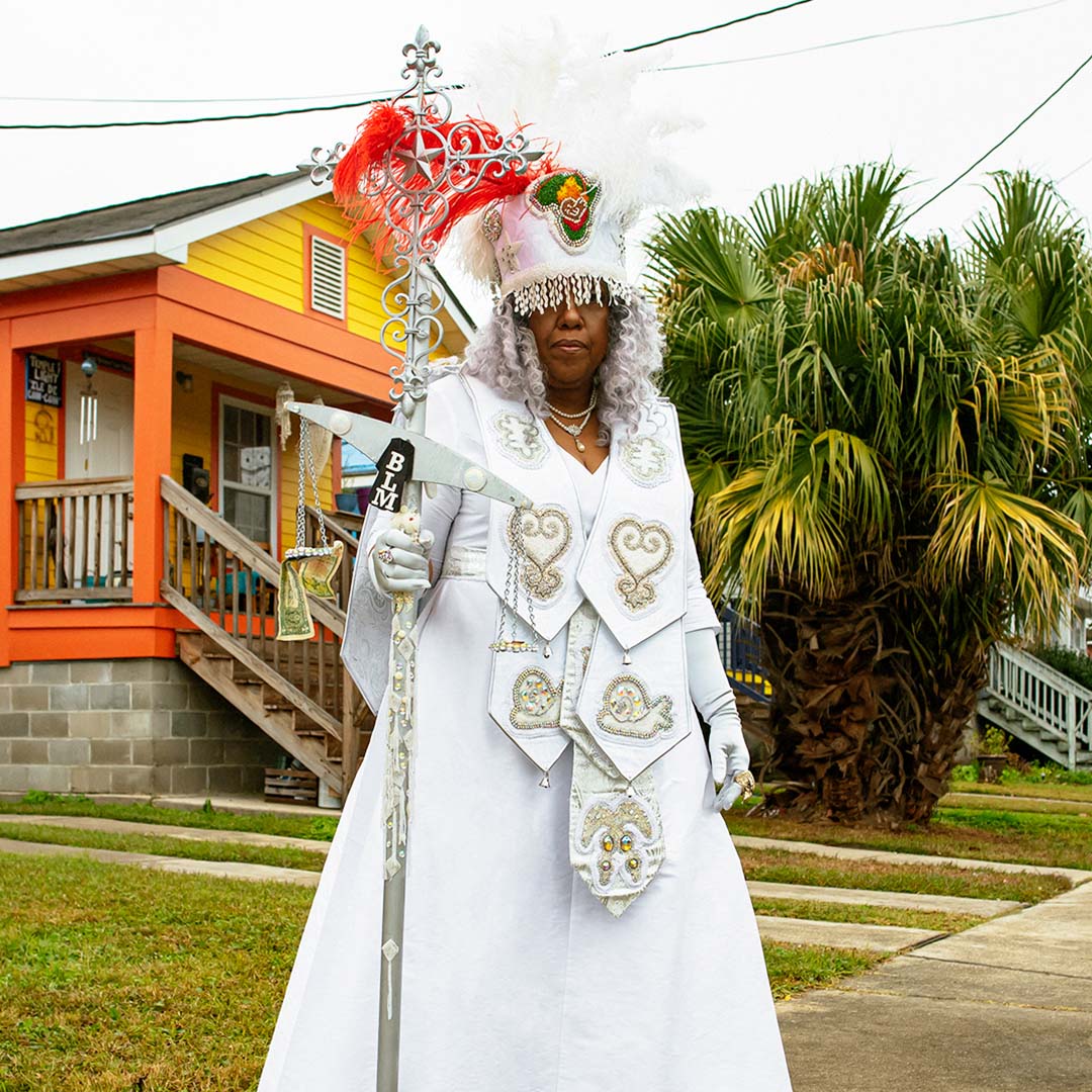 Cherice regularly honors her lineage as a Mardi Gras Indian and a member of the maroon society of self-emancipated Black folks by crafting and wearing intricately handmade traditional suits. Her late father, Donald Harrison, Sr. ushered the family into the Mardi Gras Indian tradition as Big Chief of the Guardian of the Flames, a group he formed to emphasize the importance of Mardi Gras traditions that affirm Blackness. Cherice continues this work as Big Queen of the Guardian of the Flames and is commonly known as Queen Reesie.