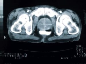 This MRI of a man’s pelvis shows that his prostate is enlarged to almost three times the regular size, which may be a sign of cancer. The prostate is marked by a cross.