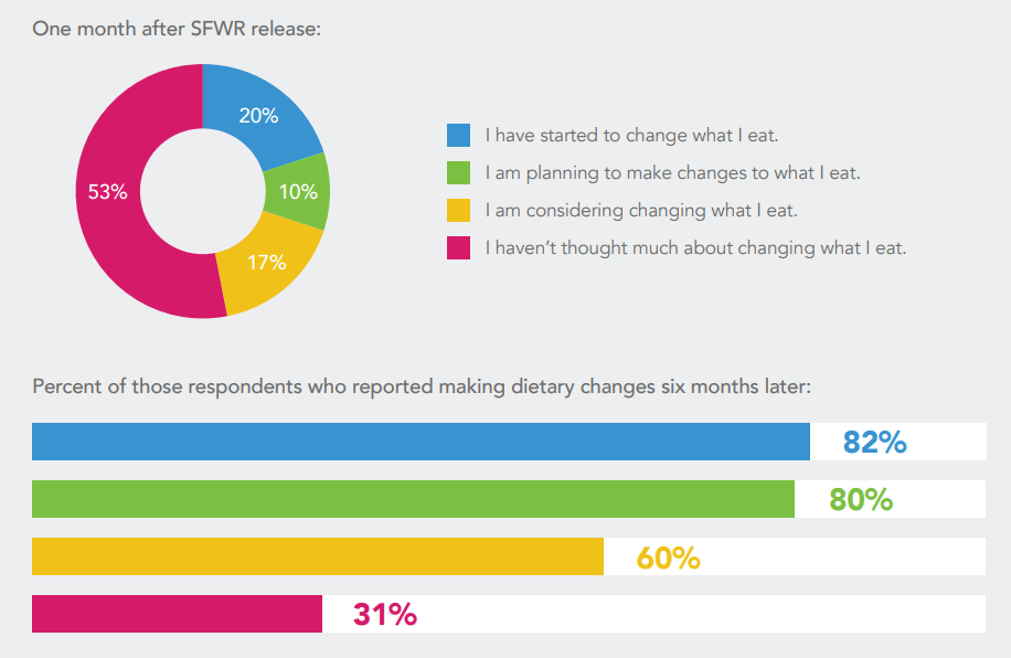 Six months later, the same participants answered another survey about dietary changes in this time period. Of those who had initially reported that they had already started to change what they eat, 82% were still maintaining those dietary changes. 80% of participants who had planned to make changes followed through with those plans, and 60% of participants who considered making changes ended up doing so. Even among participants who had not given it much thought originally, 31% ultimately made healthy dietary changes.