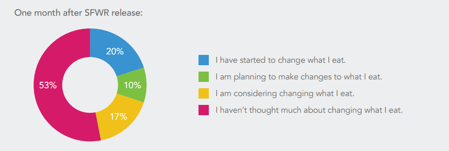 One month after viewing the report, we asked research participants about their plans to make dietary changes. While about half of participants said they hadn’t considered changing what they eat, some said they had already started to make dietary changes (20%), planned to make changes (10%), or at least considered making changes (17%).