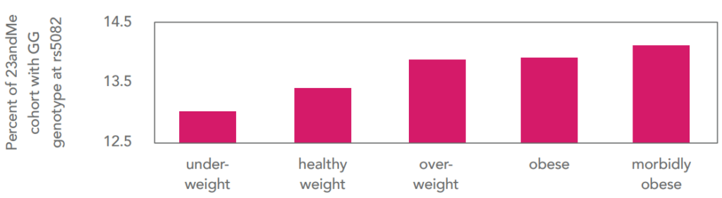 Additionally, reduced saturated fat intake was significantly associated with BMI category (p = 3 x 10-44) and genotype (p = 5 x 10-12) as evaluated by a chi-squared test. This suggests that providing personalized results – in this case, the gene-by-environment interaction between rs5082 genotype and dietary saturated fat intake – can encourage people to make healthy lifestyle changes.