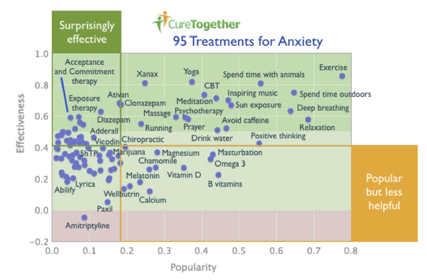 Anxiety disorders are highly treatable, yet only about one-third of those suffering receive treatment, according to Anxiety and Depression Disorders of America. In addition, anxiety disorders cost the U.S. more than $42 billion a year, so CureTogether asked people suffering from anxiety to rate the effectiveness of different treatments in an effort to help raise awareness. CureTogether’s study compiled responses from 10,980 people with anxiety, who rated the effectiveness of 95 different treatments.