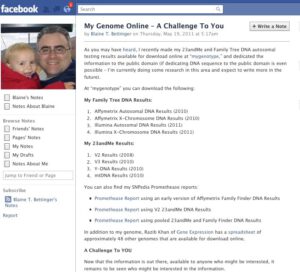Granted, people are not posting their DNA sequences en masse on their Facebook walls or deciding who to friend based on whether their haplogroup is J1c. But, starting with George Church’s Personal Genome Project, a growing list (here, here and here) of people have decided to make their genetic information public. And yes, some have posted their results on Facebook. Blaine T. Bettinger took his 23andMe raw data and made it available for download. He has even challenged others to do the same in the hope that it will lead to new discoveries, or trigger useful discussions about genetics.