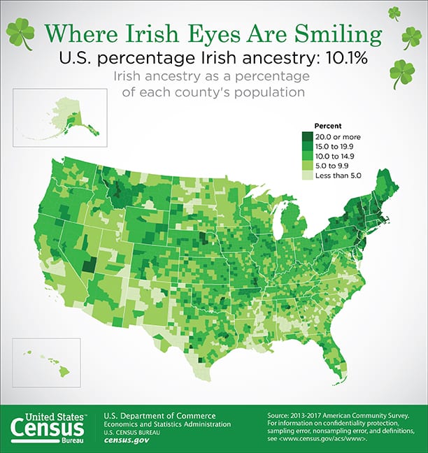 The data also showed fewer individuals with recent Irish ancestry in the Deep South and the Southwest. It’s important to note that this is not mapping genetic ancestry. Rather it is looking at concentrations of where people who reported having grandparents that were born in Ireland currently live.