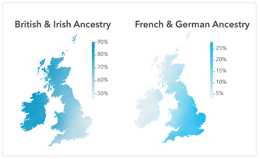 You can clearly see that French & German ancestry reaches over 25% in England’s Southeast, where British & Irish ancestry hovers around 50%. Compare that to more than 90% British and Irish ancestry in western Ireland, or more than 75% in western Wales and northern Scotland.