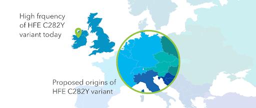 Today, the DNA variants associated with this condition are common in Ireland, leading to the nickname, “The Celtic Curse,” as it’s commonly known in the scientific and hemochromatosis communities. However, most evidence points to a central European origin of the most common variant (HFE C282Y), which was likely carried to the British Isles thousands of years ago and further spread by medieval Viking migrations. Some scientists have proposed that the C282Y variant may have protected our farming ancestors from iron-deficient diets, but the evidence for this “protective” role is limited.