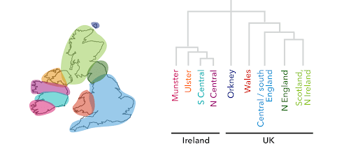 In a number of recent studies (7, 8, 9), researchers identified distinct genetic clusters within the island of Ireland. While Irish people tended to be genetically similar to each other, there were a few regional differences the study was able to identify within the DNA.